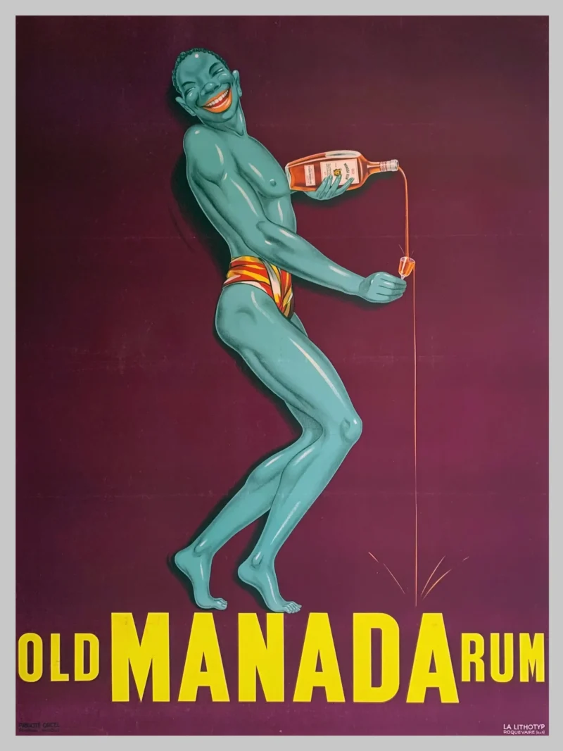 Step back into the golden age of advertising with this stunning reproduction of the “Old Manada Rum” poster. Originating in the 1930s, this piece exemplifies the bold graphic sensibilities and exotic allure characteristic of the Art Deco and early mid-century commercial art movements. The composition features a striking, stylized turquoise-skinned figure, dynamically posed and beaming with a joyful smile, as he expertly pours the amber liquid from a bottle of Manada Rum into a waiting glass. The rich, deep plum background provides a dramatic contrast to the electric yellow typography and the vibrant colors of the figure’s striped swim attire.