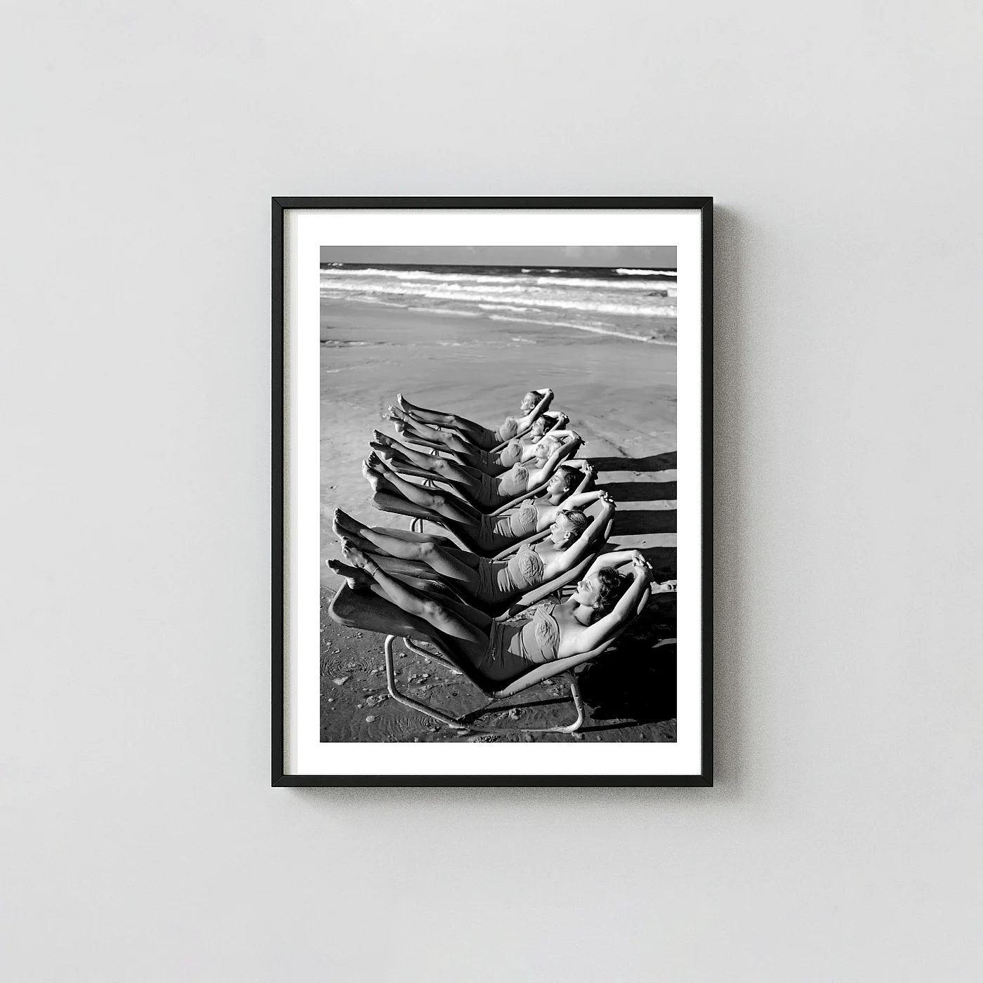This vintage photography print brings the golden age of coastal leisure directly into your home. The composition features a group of women sunbathing in mid-century swimsuits, capturing a candid moment of relaxation that feels both timeless and deeply nostalgic. With its rich tonal range and classic grain, this beach wall art serves as a window into a bygone era of simple summer pleasures.