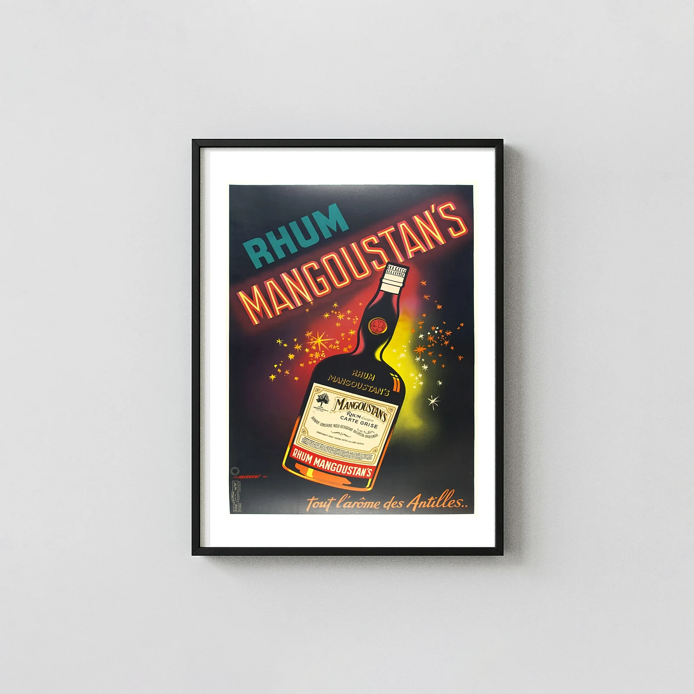 Printed against a deep, contrasting navy blue background, the design is instantly eye-catching. The bold typography spelling out "RHUM MANGOUSTAN’S" employs a unique neon-like effect, glowing in vibrant red and yellow, reminiscent of classic Art Deco and early Post-War commercial styles. The dark silhouette of the ‘Carte Grise’ rum bottle stands out, illuminated by a cascade of twinkling stars and sparks, suggesting a spirit of celebration and high quality rum.