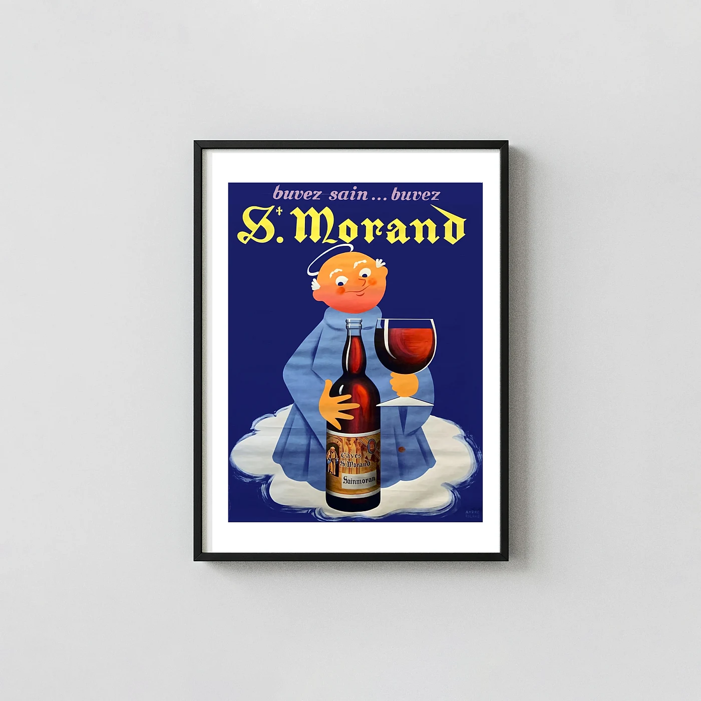 Celebrate classic French advertising with this vintage St. Morand poster. Features a cheerful monk holding wine, promoting the “Caves S. Morand” brand. Perfect for kitchen decor and bar areas.