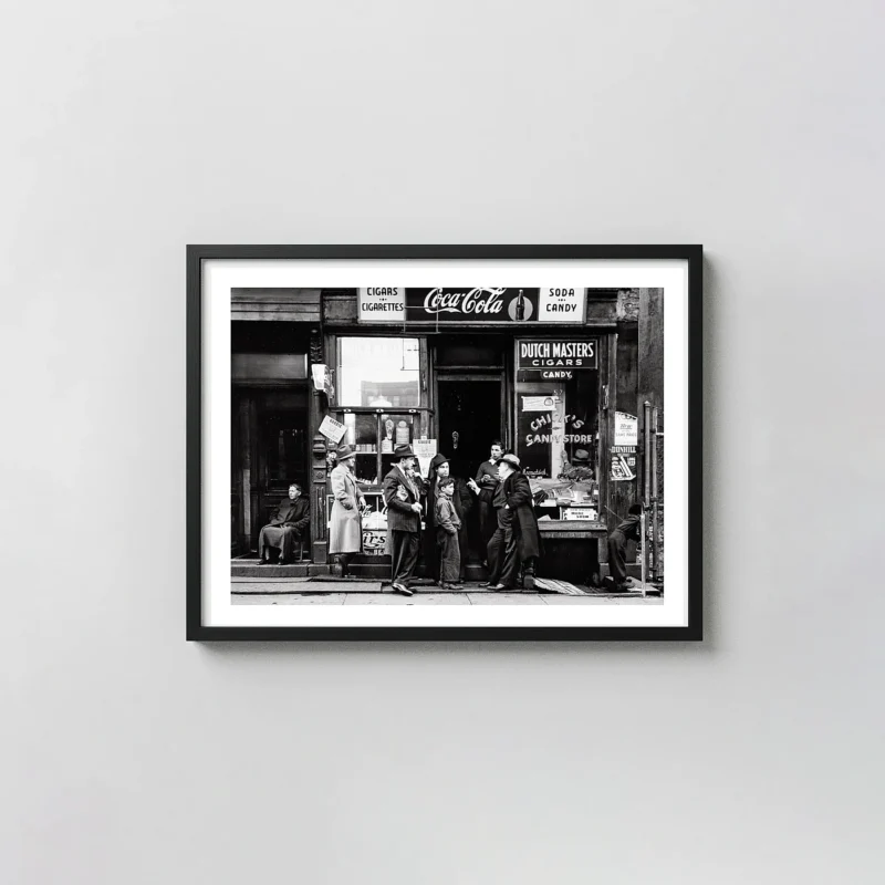 This Walter Rosenblum photography print documents a corner candy store on Pitt Street, New York City, in 1938 — kids clustered at the counter, the Lower East Side compressed into a single sharp frame.