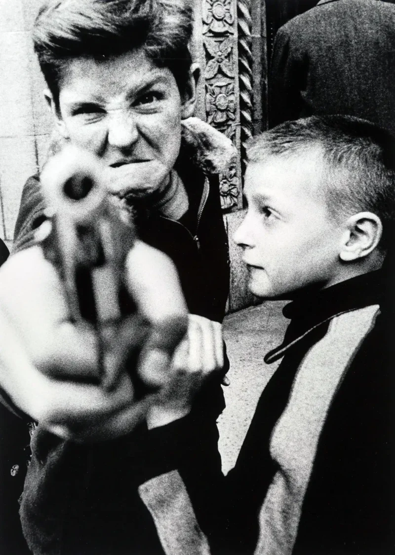 This William Klein print — Gun 1, New York, 1955 — is one of the most confrontational images in the history of street photography: a boy pointing a toy gun directly into Klein’s lens, the face a snarl, the frame claustrophobically close.