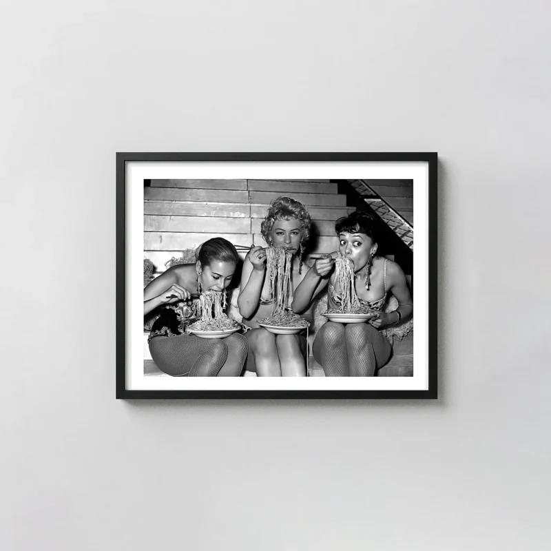 Shot in high-contrast black and white, this women eating pasta print lands somewhere between mid-century documentary photography and the kind of candid image that stops scrolling dead.