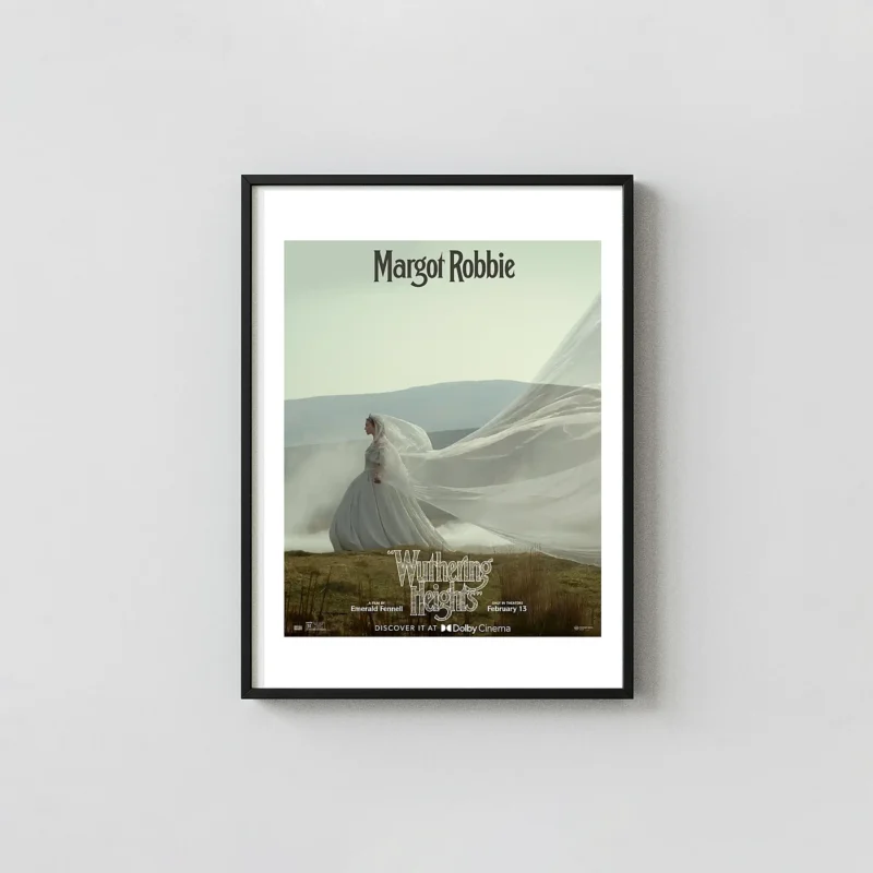 Capture the dark romance and dramatic intensity of the highly anticipated film adaptation of Wuthering Heights, directed by Emerald Fennell and starring Margot Robbie. This stunning movie poster features an iconic, ethereal image of Margot Robbie as Catherine Earnshaw, enveloped in a breathtakingly long, sweeping white gown and veil against the desolate beauty of the moors. This piece perfectly encapsulates the passion, tragedy, and gothic atmosphere of Emily Brontë’s classic novel, making it a powerful piece of literary wall art.