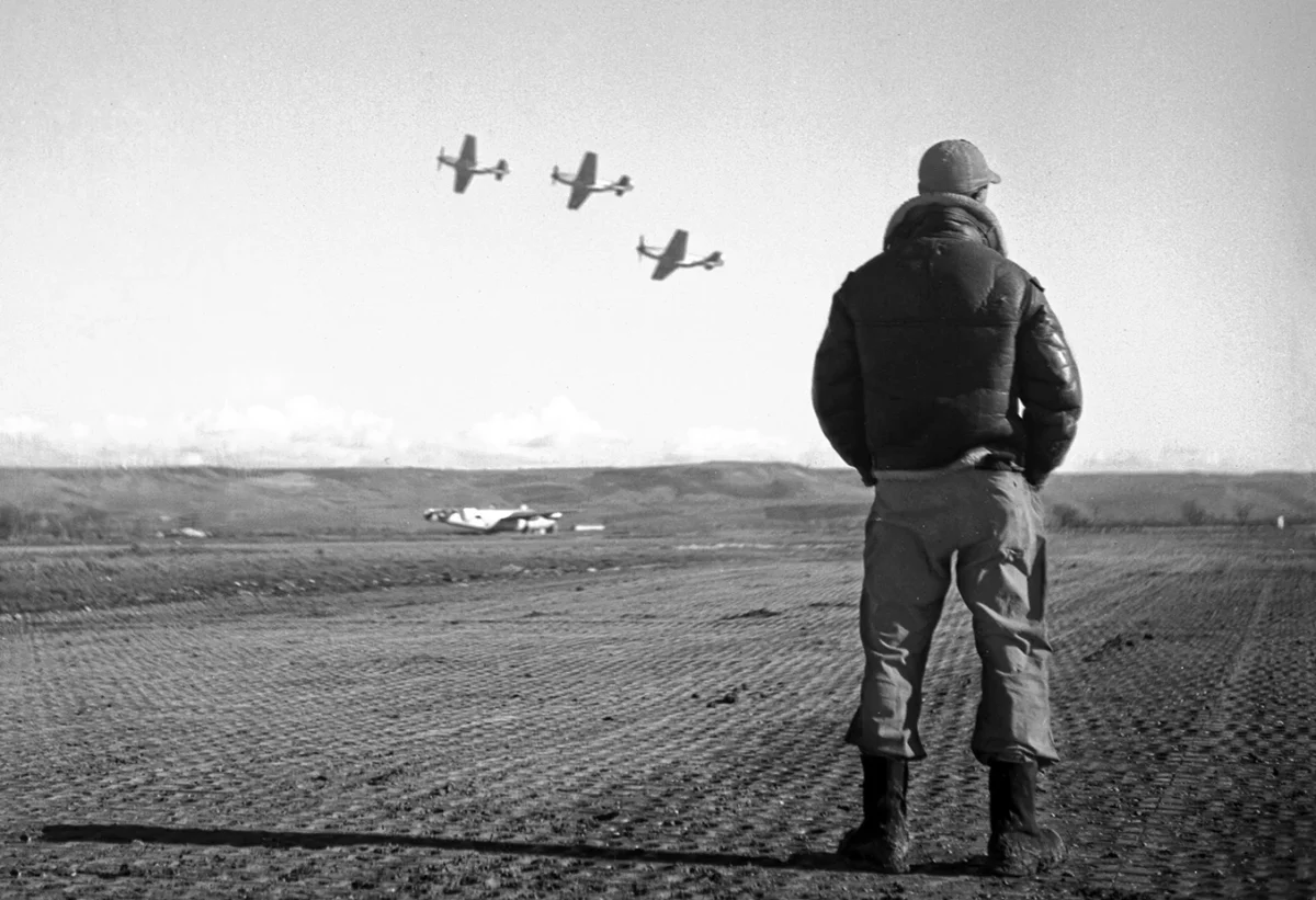 This WWII air force poster captures a heavy moment of reflection on a 1945 airfield as a lone pilot watches three fighter planes sweep across the horizon. The composition is grounded by the gritty texture of the Pierced Steel Planking (PSP) runway, a signature of military engineering during the era that allowed for rapid airbase deployment in harsh environments. The pilot, seen from behind, wears a thick B-3 sheepskin flight jacket, suggesting the cold, high-altitude conditions these men faced while operating the most advanced machinery of their time. The three planes, likely P-51 Mustangs, appear as sharp silhouettes against the pale sky, caught in a tight formation that speaks to the precision and discipline of the United States Army Air Forces during the closing months of the war.