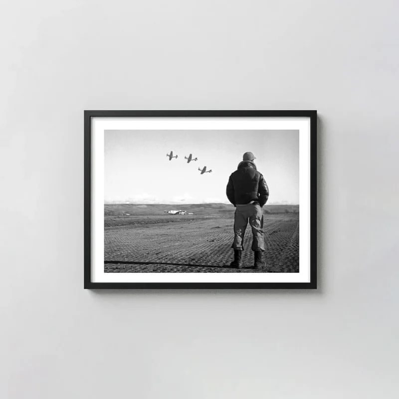 This WWII air force poster captures the quiet intensity of a 1945 pilot watching his squadron fly over the airfield. Our vintage military wall art is printed on 200 GSM museum-grade matte paper for a glare-free finish.