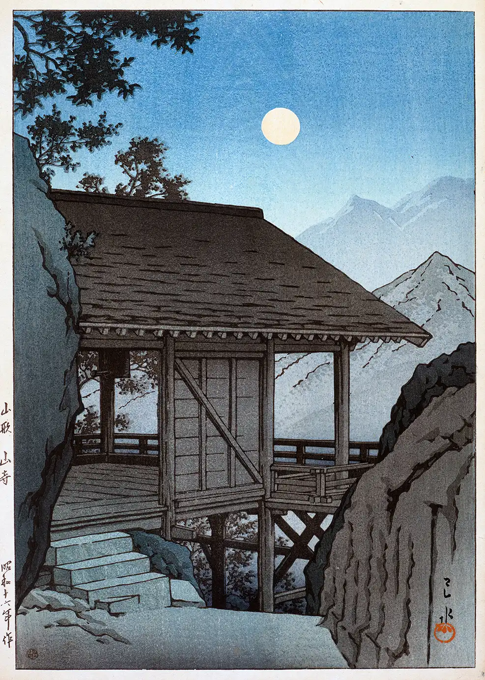 In the context of 20th-century Japanese art, the Yamadera Temple Print serves as a significant example of how artists captured the spiritual essence of remote locations. The year 1941 marked a period of transition in Japan, yet this piece remains focused on the enduring calm of the natural world and sacred spaces. The artist uses a sophisticated layering technique to create depth, placing dark, silhouetted foliage in the foreground to frame the brightly lit moon and the distant mountain ridges. This framing technique draws the eye toward the structural details of the temple, from the support beams of the deck to the intricate shingle work on the roof. Every line in this Japanese landscape painting is deliberate, conveying the permanence of the temple against the shifting shadows of the night.