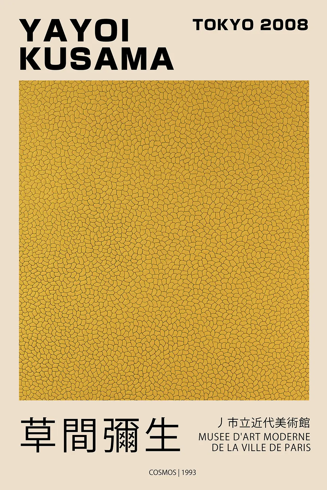 This Yayoi Kusama Cosmos Poster serves as a definitive visual record of the artist’s obsession with infinite repetition and the dissolution of the self. Originally inspired by the 1993 work titled Cosmos, this specific layout commemorates the Tokyo 2008 exhibition and the partnership with the Musee d’Art Moderne de la Ville de Paris. The visual field is dominated by a dense, interlocking yellow net structure that creates a sense of rhythmic depth and psychological intensity. This pattern, known globally as the infinity net, represents a foundational element of Kusama’s career, originating from her early hallucinations and evolving into a signature style that defines modern Japanese art history.