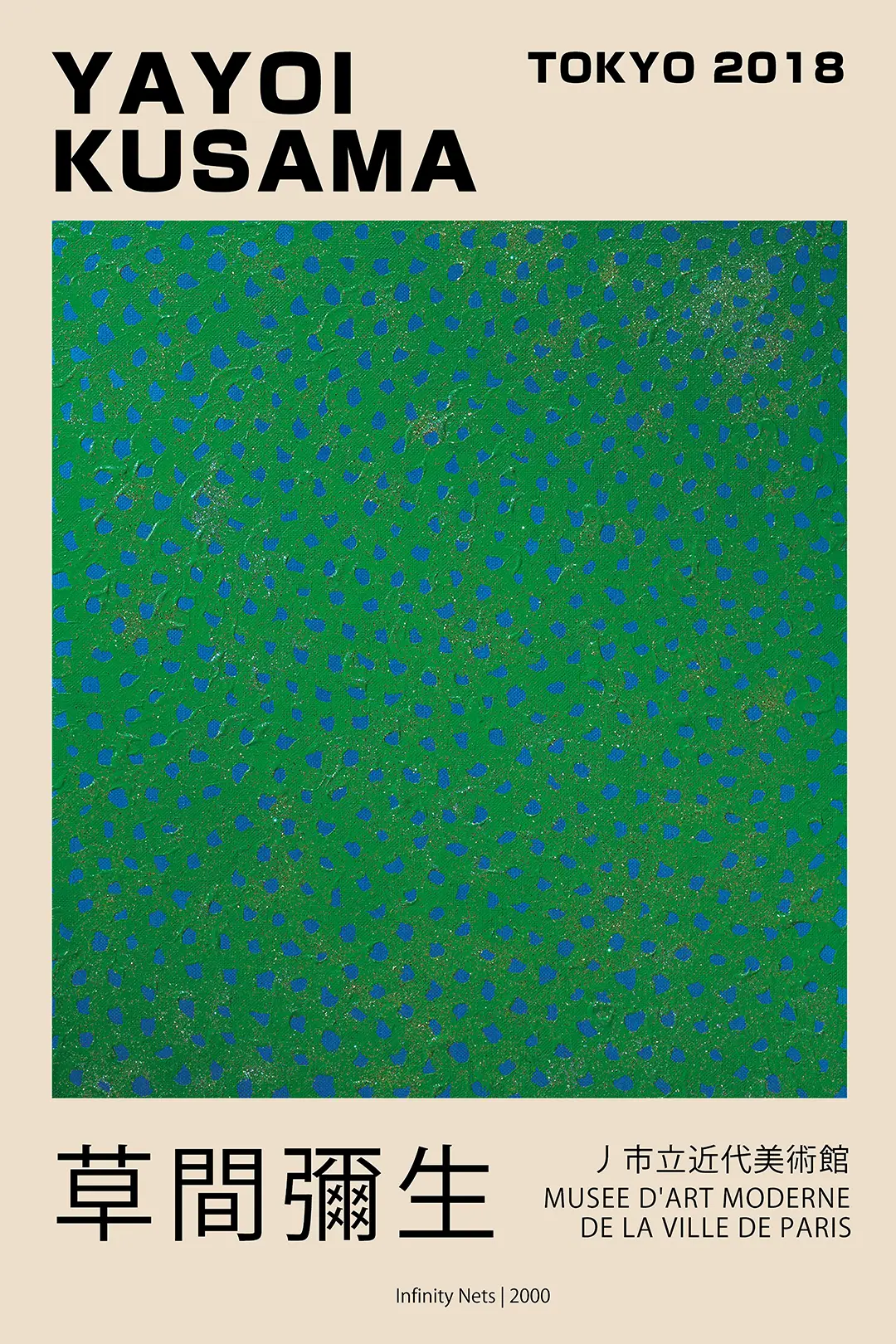 The Yayoi Kusama poster presented here references the Tokyo 2018 exhibition, connecting the viewer to the specific period where her work gained unprecedented international recognition. The Infinity Nets series itself began in the late 1950s, representing a radical departure from traditional painting styles. This particular 2000 iteration highlights a sophisticated color contrast, moving away from the monochromatic white-on-white origins toward a more vibrant, saturated palette. The inclusion of text referencing the Musee d’Art Moderne de la Ville de Paris adds an archival depth to the piece, making it a significant acquisition for collectors of modern exhibition ephemera.