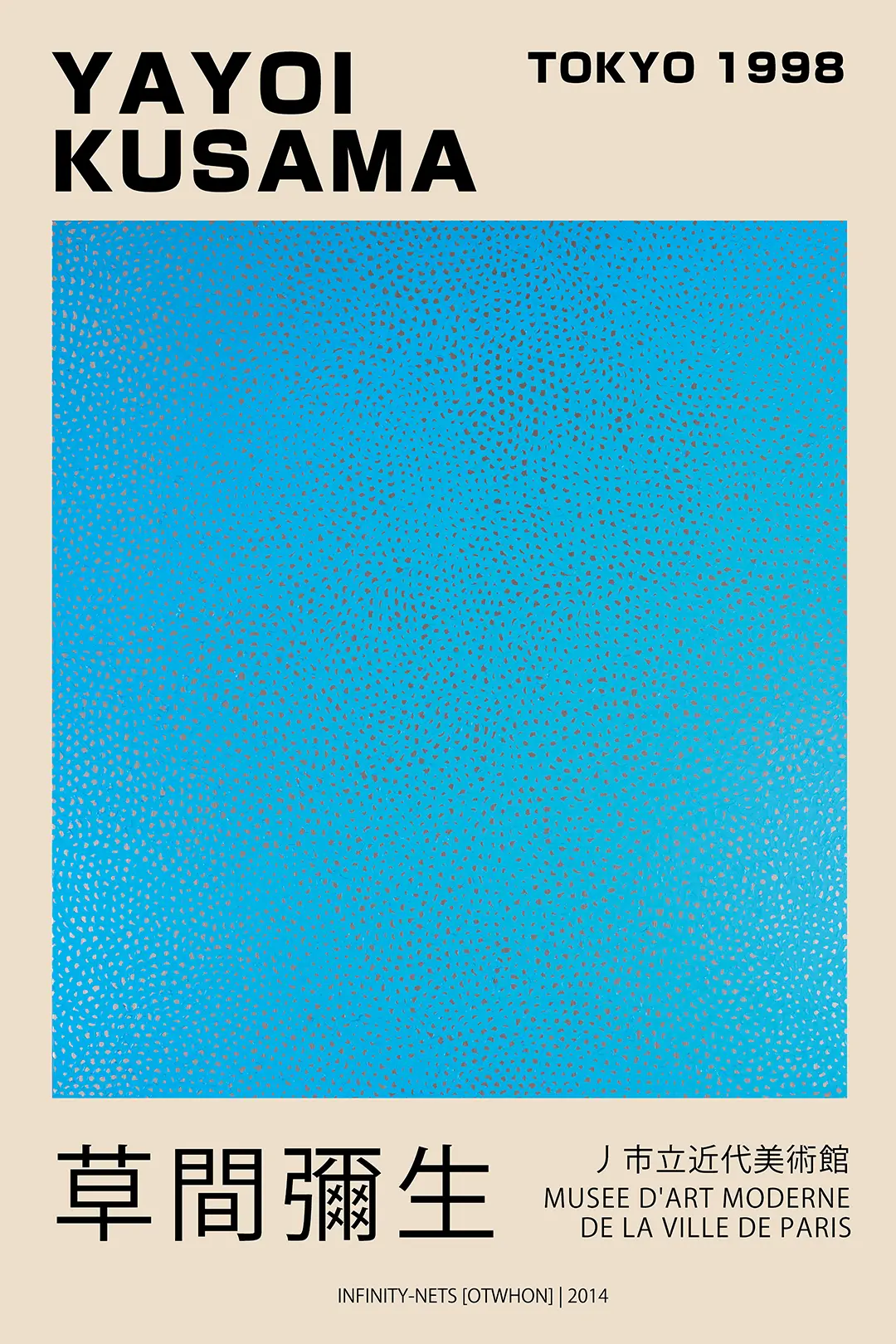 This Yayoi Kusama poster captures the repetitive, meditative essence of the world-renowned artist’s most celebrated series, the Infinity Nets. This specific Yayoi Kusama poster focuses on the 2014 iteration of the work, presented in a deep, monochromatic blue that highlights the obsessive, rhythmic brushwork associated with the artist’s conceptual practice. The design integrates historical typography, referencing the 1998 Tokyo exhibition and the Musee d’Art Moderne de la Ville de Paris, making it an essential acquisition for enthusiasts of Japanese contemporary art.