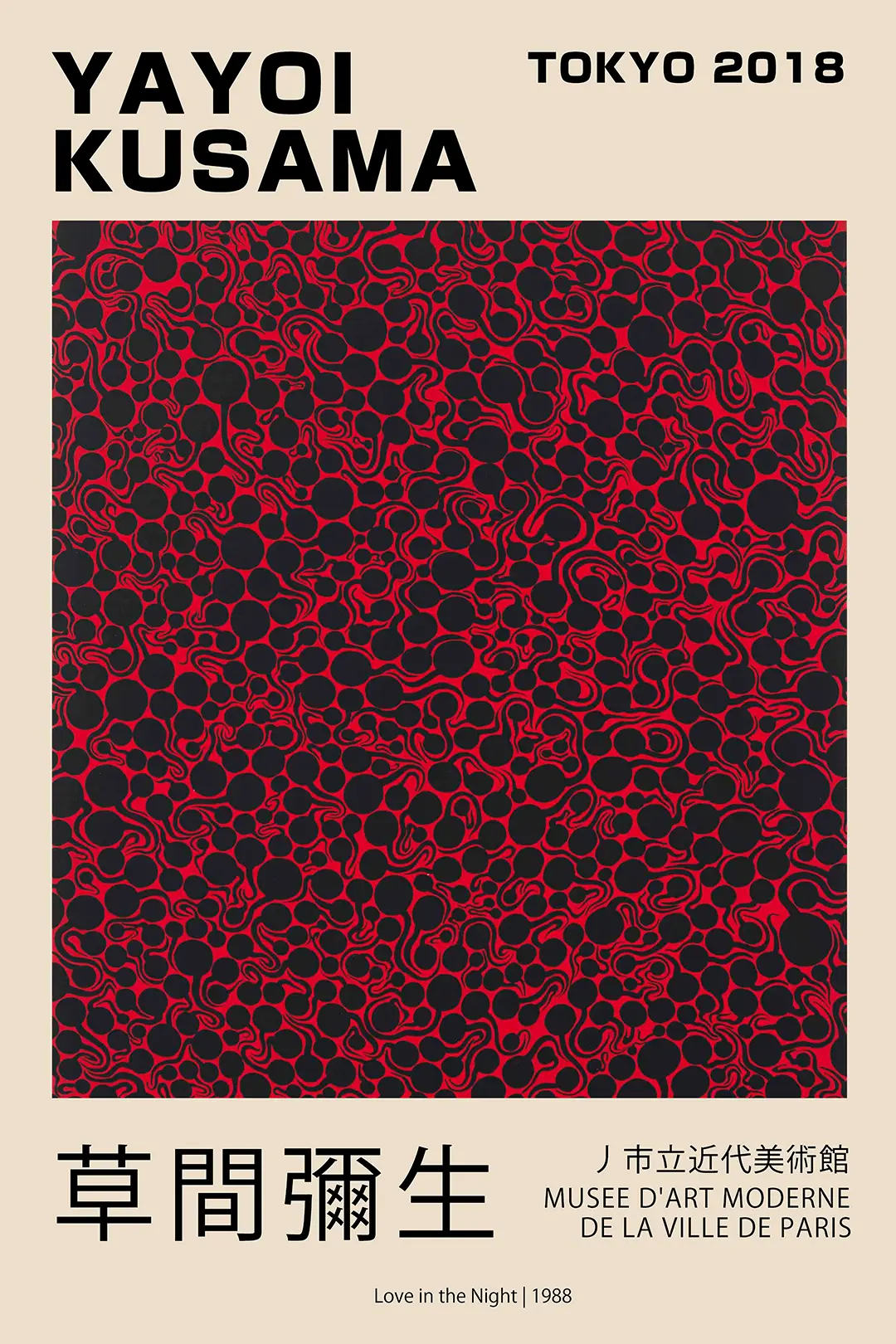 This Yayoi Kusama poster represents a profound exploration of the artist’s signature obsession with repetition and the concept of self-obliteration. Originally based on the 1988 work titled Love in the Night, this visual reproduction captures the dense, interconnected black shapes that define the artist’s mid-career period. The composition was prominently featured during the 2018 Tokyo retrospective and organized in conjunction with the Musee d’Art Moderne de la Ville de Paris. The high-contrast interaction between the deep black ink and the saturated red background provides a rhythmic energy that fits a wide range of interior design themes.