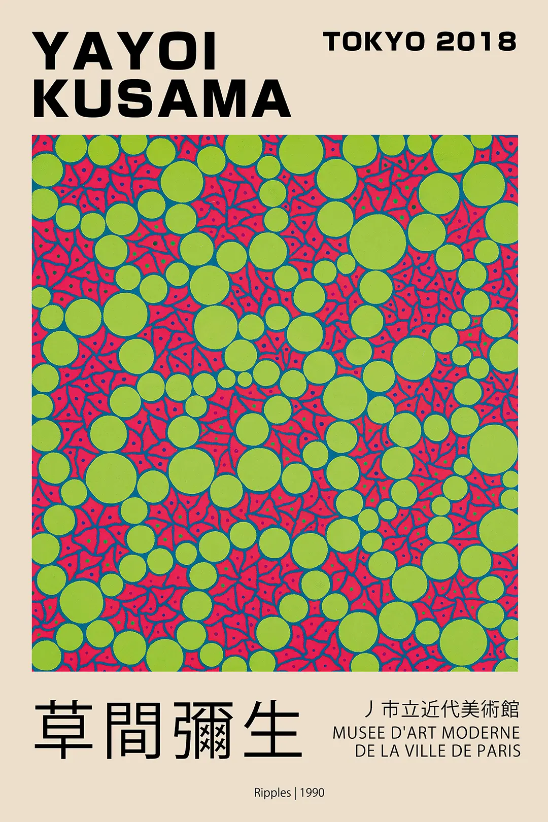 Yayoi Kusama poster showcasing the iconic ripples 1990 print pattern with lime green circles and red cellular webbing. This Japanese avant-garde art reproduction is printed on archival 200 GSM museum-grade paper.