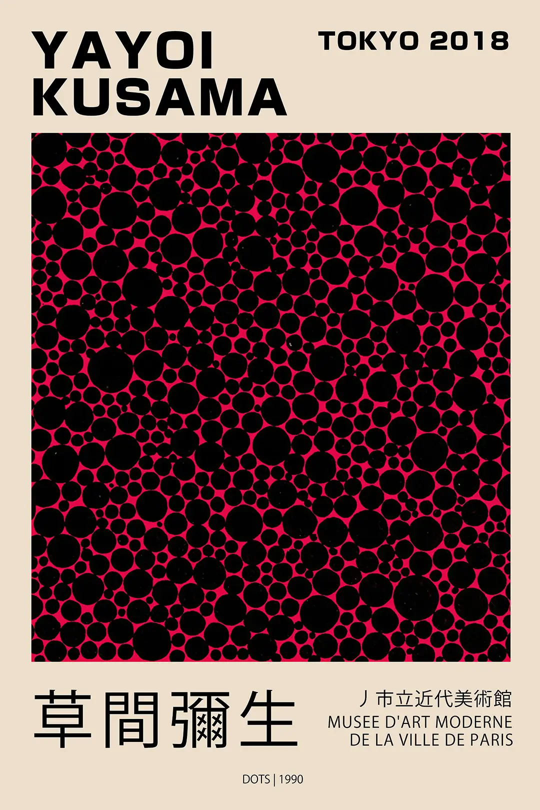 This Yayoi Kusama poster captures the obsessive repetition and rhythmic energy of the 1990 Dots motif, rendered in high-contrast black and deep pink hues. This specific composition references the historic collaboration between the Tokyo 2018 exhibition and the Musee d’Art Moderne de la Ville de Paris. The visual field is saturated with varying sizes of polka dots, creating a sense of infinite expansion that reflects the artist’s unique psychological perspective and her lifelong fascination with obliteration through pattern. Collectors of modern art will appreciate the sharp typography that balances the organic nature of the hand-drawn circles.