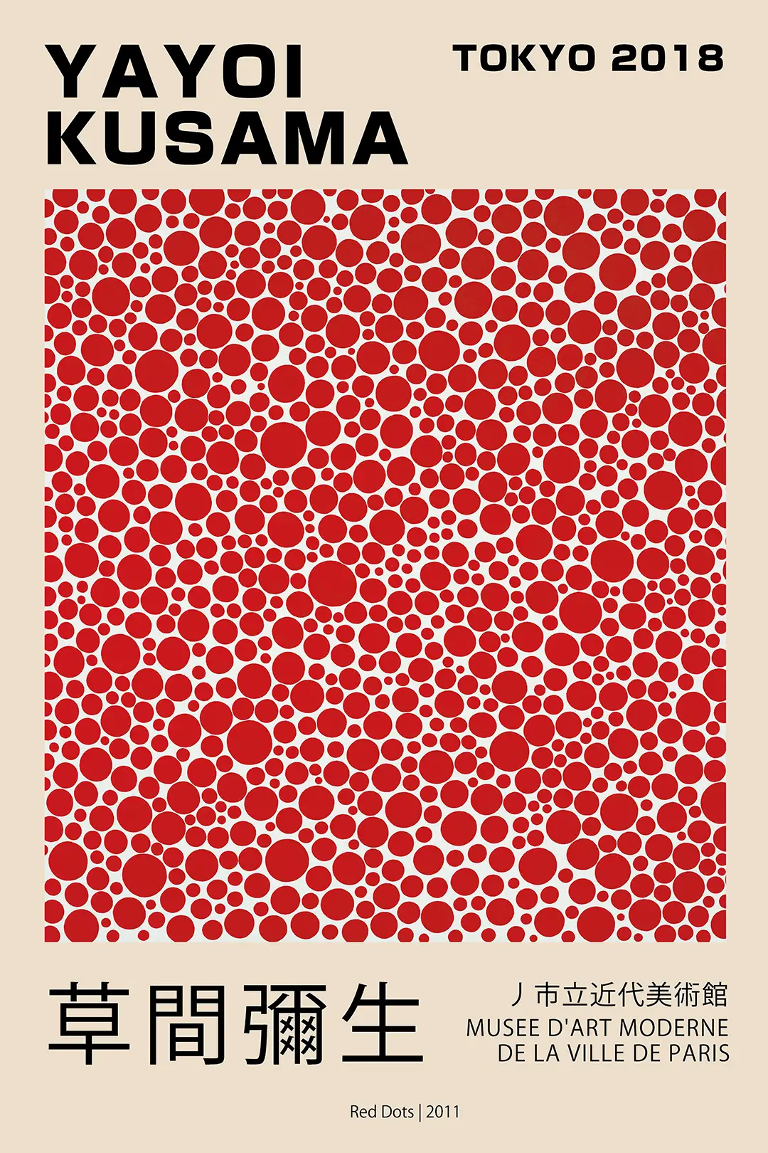 The origins of this specific imagery date back to the 2011 Red Dots series, which later became a focal point of the Tokyo 2018 retrospective. As a leading figure in the pop art and conceptual movements, the artist utilizes these motifs to explore themes of self-obliteration and psychological depth. This Yayoi Kusama poster captures that specific era of her career where large-scale installations were translated into accessible graphic formats. The typography featured on the print includes both Japanese characters and French gallery notations, signaling the global reach of her contemporary influence. By incorporating these textual elements, the print functions not just as wall decor but as a documentary artifact of a significant moment in art history.