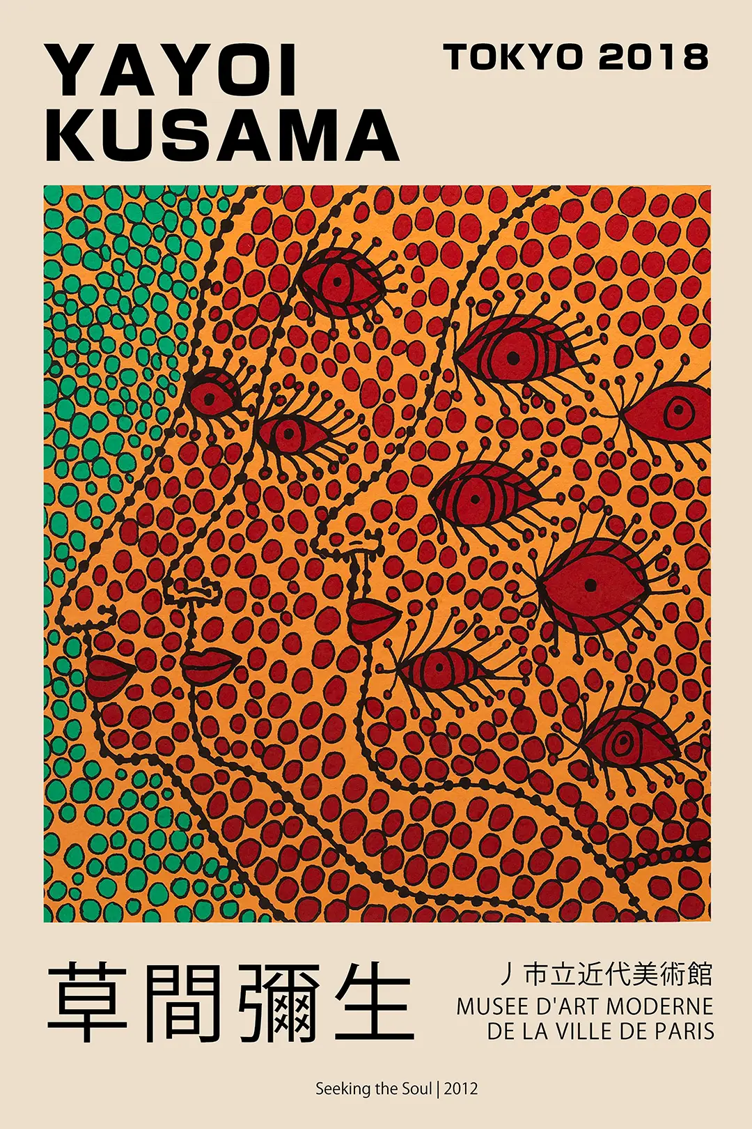 The visual structure of this Yayoi Kusama poster is organized around a high-contrast orange and red palette. Dozens of stylized eyes, a recurring motif in the artist’s later career, gaze outward from the frame. These ocular elements are interwoven with profile outlines of faces, all constructed through meticulously placed black dots. This technique creates a sense of rhythmic movement across the surface, drawing the viewer into a dense thicket of pattern. The use of Japanese typography at the top and bottom of the print adds a layer of cultural authenticity, marking its origin in the Tokyo art scene of 2018. This Yayoi Kusama poster is not merely a decorative object but a study in the psychological power of repetition.