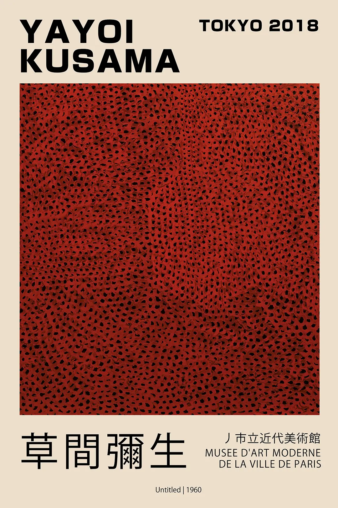 This Yayoi Kusama poster showcases the intense visual language of the legendary Japanese artist, specifically focusing on her Infinity Nets series from 1960. The red and black pattern presented here is not merely a decorative arrangement but a window into a psychological state of mind characterized by repetition and accumulation. By removing the boundaries of the traditional subject, the artist creates a field of vision that extends indefinitely beyond the frame. This Yayoi Kusama poster serves as a documentation of the 2018 exhibition in Tokyo, which later moved to the Musee d’Art Moderne de la Ville de Paris. The contrast between the deep red pigments and the black recessed spaces creates a vibrating optical effect that commands attention in any interior space.