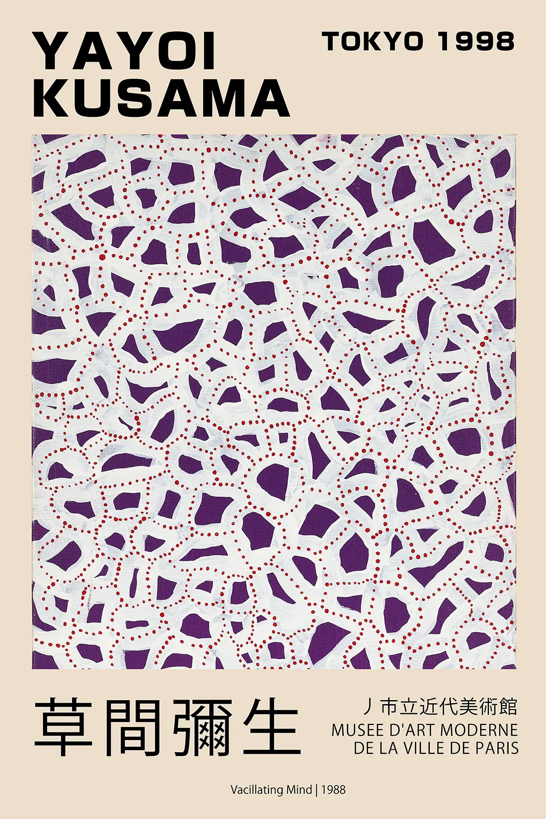 This Yayoi Kusama poster presents a faithful recreation of the 1988 original work titled Vacillating Mind, capturing the rhythmic intensity of the artist’s legendary Infinity Nets series. Originally created during a prolific period in the late eighties, this specific composition features a dense lattice of white paint layered over a rich, deep purple ground. Tiny, meticulously placed red dots anchor the intersections of the web, creating a visual vibration that characterizes the artist’s exploration of psychological depth and repetitive patterns. This print serves as a document of the 1998 exhibition in Tokyo and its association with the Musee d’Art Moderne de la Ville de Paris, making it an essential acquisition for those tracking the global trajectory of Japanese contemporary art history.