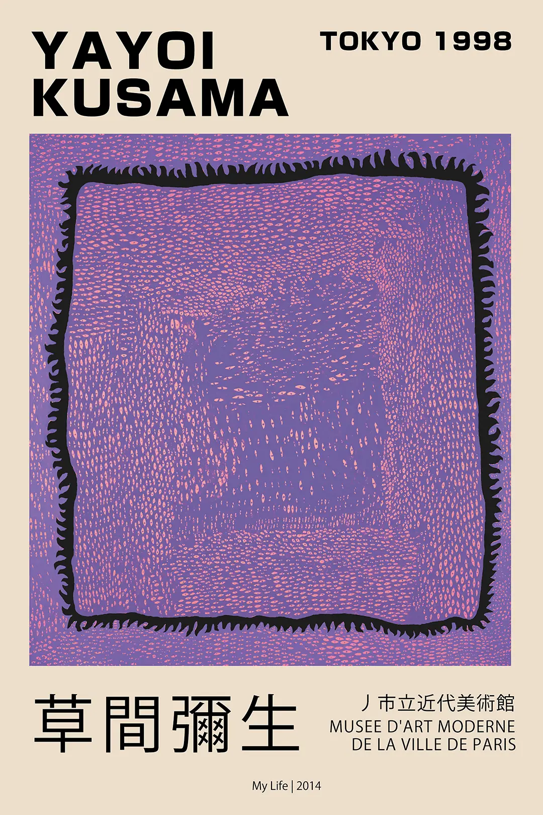 This Yayoi Kusama print honors the aesthetic legacy of the 1998 Tokyo exhibition, specifically referencing the ‘My Life’ creative period. The composition features a central, saturated violet square defined by a dense, repetitive pattern of organic textures. This central field is framed by a bold, black jagged border that creates a striking visual tension against the muted cream-colored background. The typography uses a clean, modernist sans-serif font for the name and exhibition details, while traditional Japanese characters add cultural authenticity to the design.
