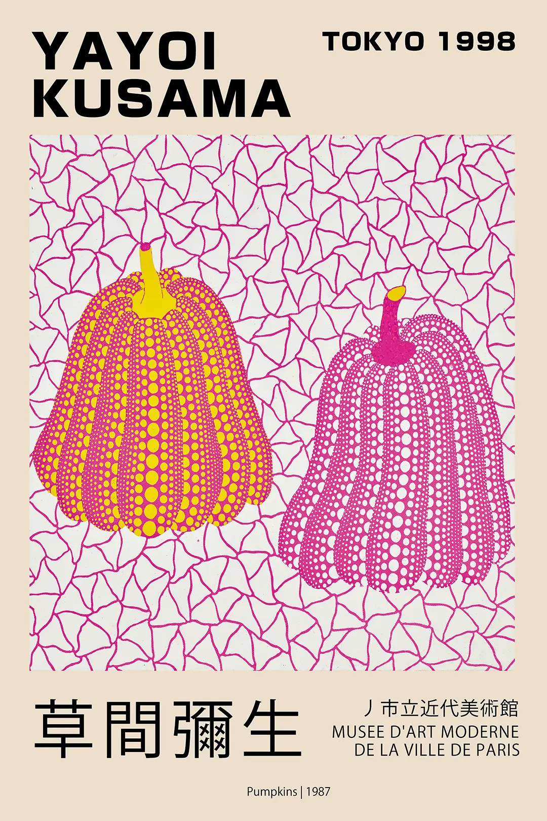 The Yayoi Kusama pumpkin poster serves as a definitive visual record of the 1987 pumpkin series featured during the landmark Tokyo 1998 exhibition. This specific composition presents two distinct organic forms: one rendered in a vivid yellow with deep magenta polka dots, and a second in a soft pink with white circular patterns. These elements are set against a high-contrast background of pink and white geometric lines, an aesthetic known globally as the Infinity Net. This motif reflects the psychological depth and rhythmic repetition central to the artist’s prolific career.