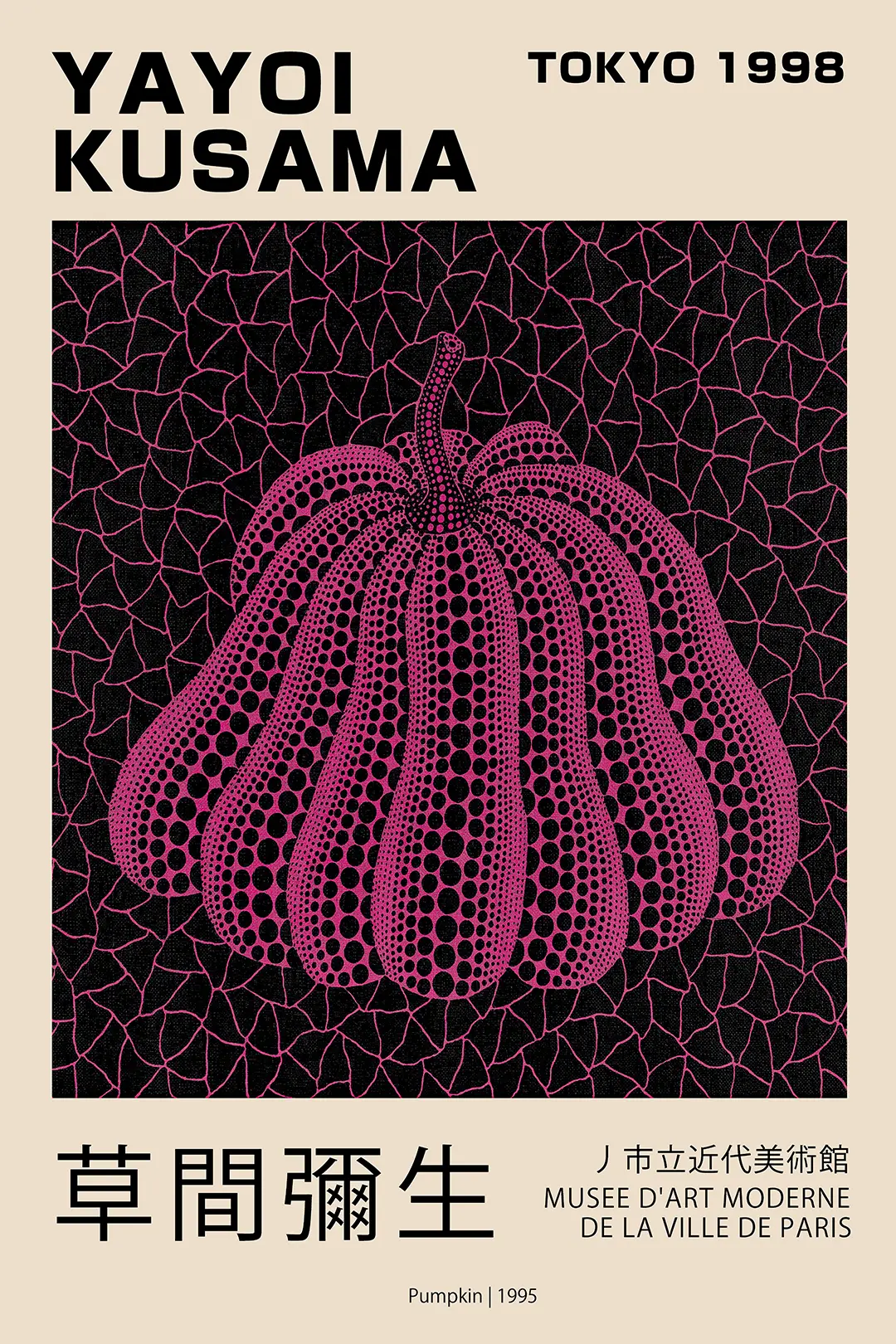 This Yayoi Kusama pumpkin print represents a pivotal era in Japanese contemporary art, specifically celebrating the 1998 Tokyo exhibition of the artist’s 1995 sculptural and graphic work. The visual composition features a bold, organic pumpkin form centered against a high-contrast black background. The background itself is meticulously detailed with an intricate web-like pattern in magenta, known as the artist’s signature ‘Infinity Net’ style. This print captures the rhythmic precision and psychological depth of one of the world’s most influential living artists.