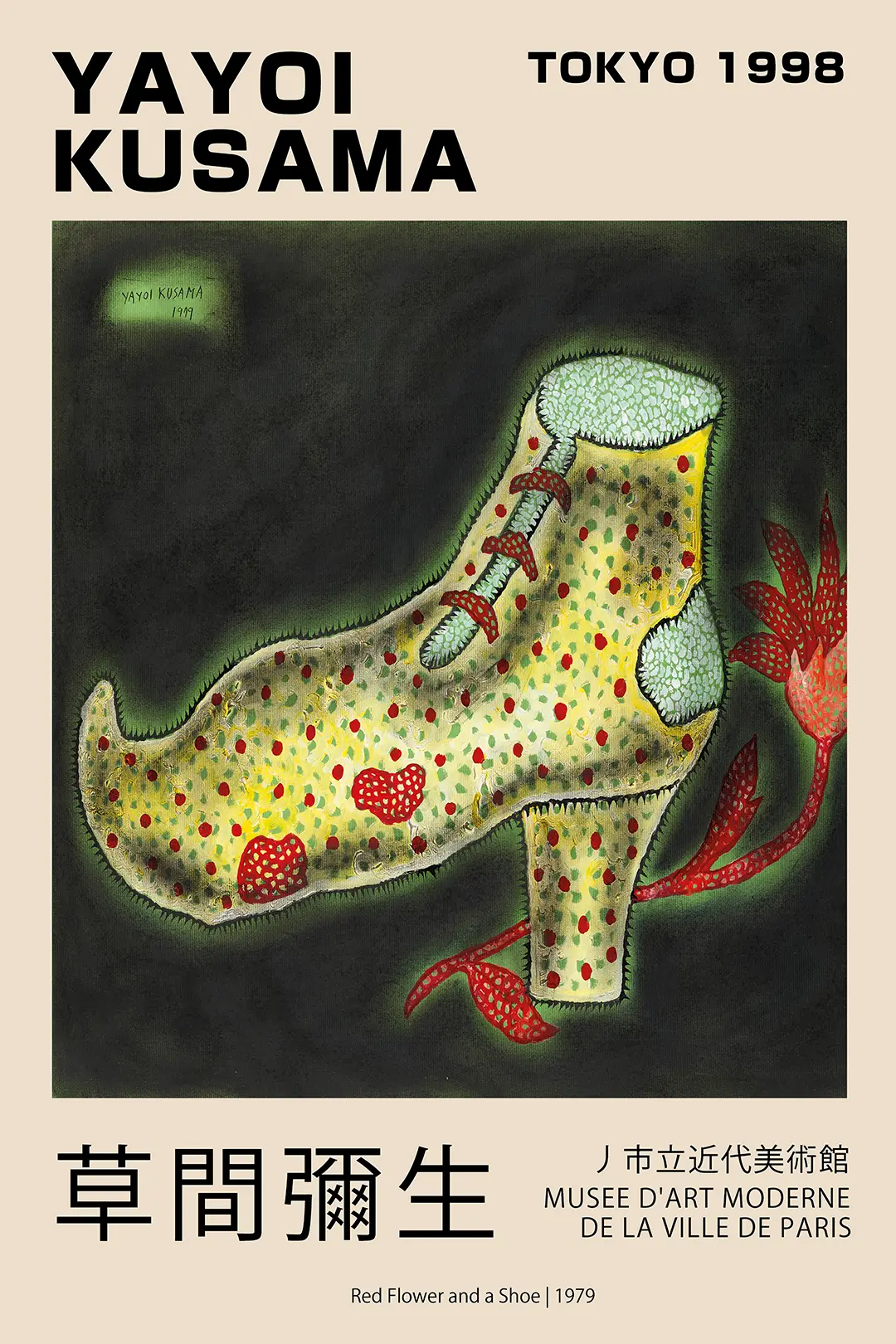 This Yayoi Kusama shoe print captures the essence of the 1979 original work titled Red Flower and a Shoe, which was prominently featured during the 1998 exhibition in Tokyo. The composition presents a singular high-heeled shoe, rendered in a vibrant yellow hue and meticulously decorated with the artist’s signature polka dots and organic net patterns. A deep red flower emerges from a thin branch, creating a stark contrast against the dark, shadowy background that is rimmed with a subtle green luminescence. The typography on the poster reflects the historic collaboration between the Musee d’Art Moderne de la Ville de Paris and the Japanese art scene of the late 1990s.