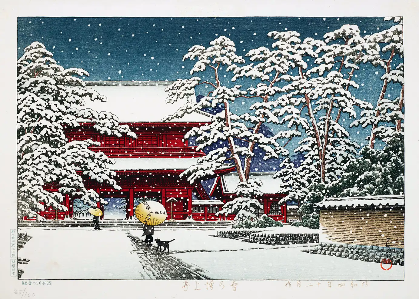 As a cornerstone of Japanese woodblock art, the **Zojoji Temple print** utilizes traditional carving techniques to render complex weather patterns. Hasui was famous for his ability to translate atmospheric conditions into the medium of wood and ink. Here, the falling flakes are not mere dots but textured layers that suggest depth and movement. The inclusion of a lone figure carrying a traditional yellow wagasa umbrella, accompanied by a small dog, introduces a narrative element that grounds the monumental architecture in human scale and everyday life in Tokyo.